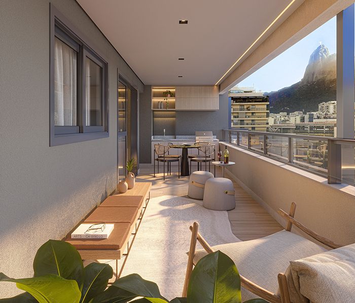Perspectiva artística da varanda do apartamento de 2 quartos do Arq Life Design Botafogo.