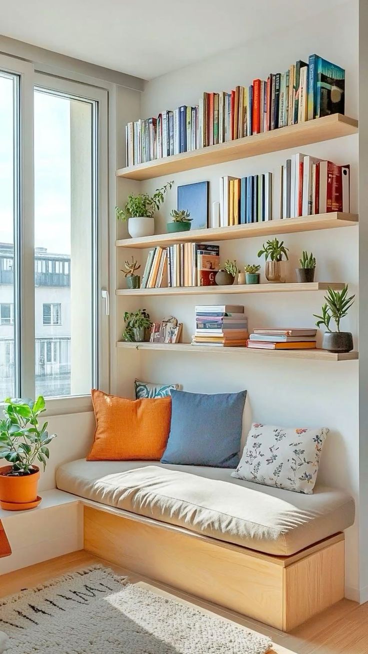 Legenda: Livros, plantas e objetos afetivos deixam o cantinho da leitura mais vivo e cheio de personalidade. Reprodução: Pinterest.
